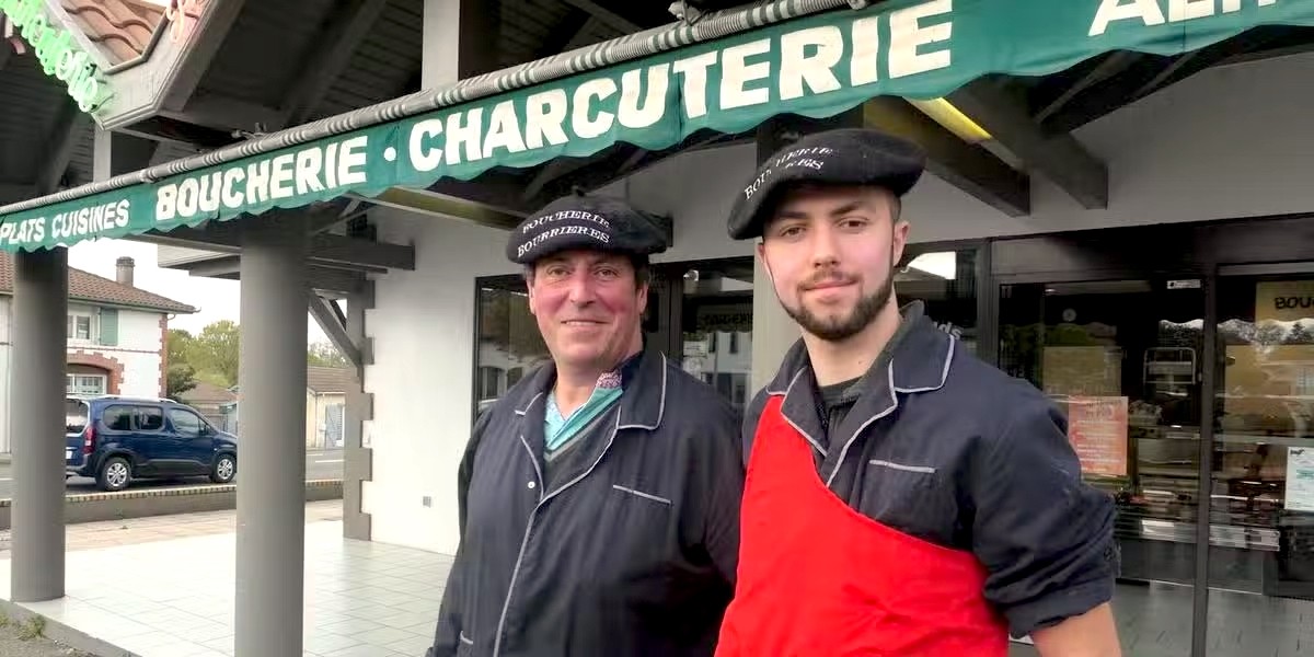Chez les Bourrières, la viande, c'est une histoire qui se transmet de père en fils. Christophe, le père de Kévin, est boucher depuis 41 ans. C'est à ses côtés que Kévin a grandi avec la passion du métier, avant de se former au CFA de Mont-de-Marsan. En 2023, une belle opportunité se présente : reprendre cette boucherie à Saint-Geours-de-Maremne. Un petit village dynamique, un esprit familial, et surtout l'envie de suivre les traces de son père — devenir son propre patron. Aujourd'hui, père et fils travaillent ensemble dans la boutique, entre fous rires et moments de complicité. Parce qu'ici, être boucher, c'est bien plus qu'un métier : c'est un engagement quotidien envers la qualité, la transparence et la confiance.